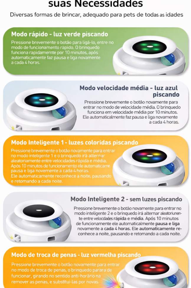 Diferente de brinquedos tradicionais que rapidamente perdem o interesse do animal, o Brinquedo Interativo Automático para Gatos 2 em 1 – PetPrático™ possui 5 modos eletrônicos interativos que criam padrões diferentes de movimento.
