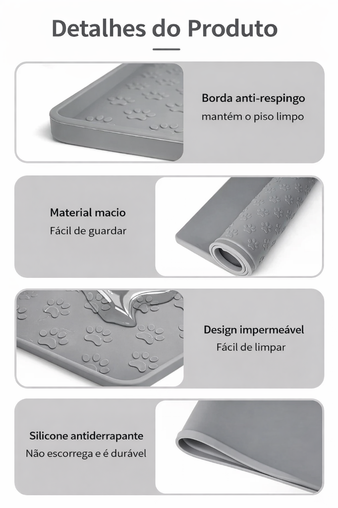 Com o Tapete PetPrático™, a hora da alimentação deixa de ser sinônimo de bagunça. O ambiente permanece mais limpo, o piso fica protegido e o cantinho do seu pet se torna muito mais organizado.